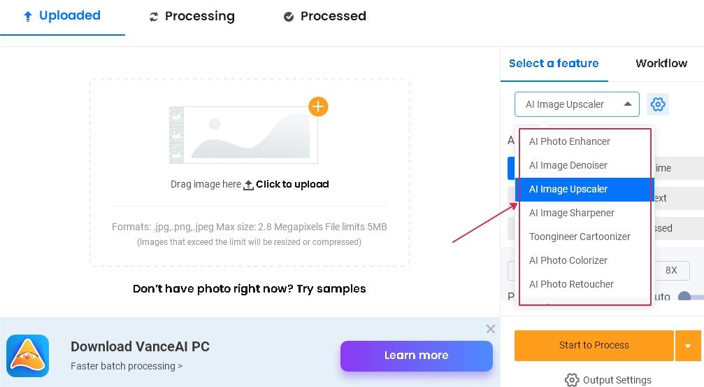 - Загружаете фото и выбираете функцию, потом жмете “Start to process”.