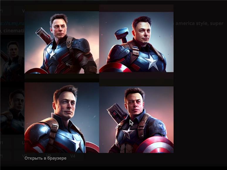 В нейросеть MidJourney, можно совмещать два фота с помощью “/imagine”. В prompt, вставляем две ссылки на фотографии. В конце добавляем “--v 4”, что означает совместить фотографии. Иногда требуется указать детали, например, добавить оружие или мышцы на руках. Все это нужно перечислять через запятую, т.е. кроме фотографий следует еще указать дополнительные параметры, которые будут учитываться при генерации картинки с персонажем. Пример: