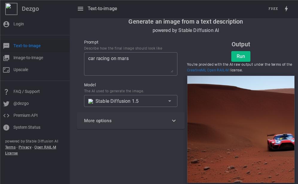 Нейросеть онлайн бесплатно генерирует изображение. На сайте два раздела. Text-to-Image – генерация происходит по описанию указанного в Prompt. Текст следует составлять на английском, например “car racing on mars”.