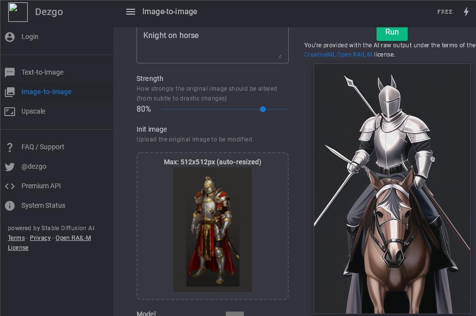 Если выбрать Stable Diffusion картина получится в художественном стиле, если указать Anything 3.0(anime), то иллюстрация нарисуется в стиле японской мультипликации. Простой пример, взяв изображение рыцаря из интернета, указав в описании “knight on horse” и выбрав модель anime, мы получим.