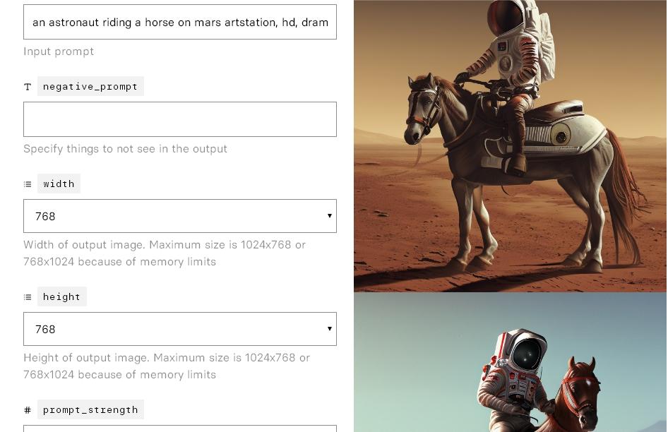 Как и остальные работает по модели Stable Diffusion, т.е. генерирует по описанию. В строке требуется указать через запятую, что должно входить в картинку, но есть дополнительное поле negative_prompt. Здесь, напротив, добавляем то, чего не должно отображаться в иллюстрации. Если нужно за раз сгенерировать несколько картинок просто укажите значение num_outputs (максимально 4). Чтобы запустить генерацию нажмите “Submit”.