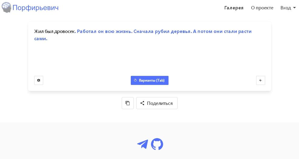 Сайт предлагает придумать за вас историю. В текстовое поле нужно ввести ее начало и нажать “Дополнить”. Если вариант чем-то не устраивает, то кнопкой “Варианты”, можно заново все переписать. Порфирьевич прост в использовании, и не требует регистрации.
