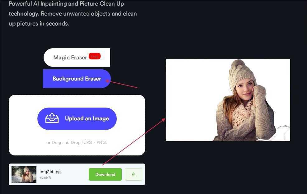 На сайте BgEraser, также встроен инструмент удаления заднего фона. Чтобы им воспользоваться следует переключить на Background Eraser и загрузить фото, дальше все сделает нейросеть онлайн.