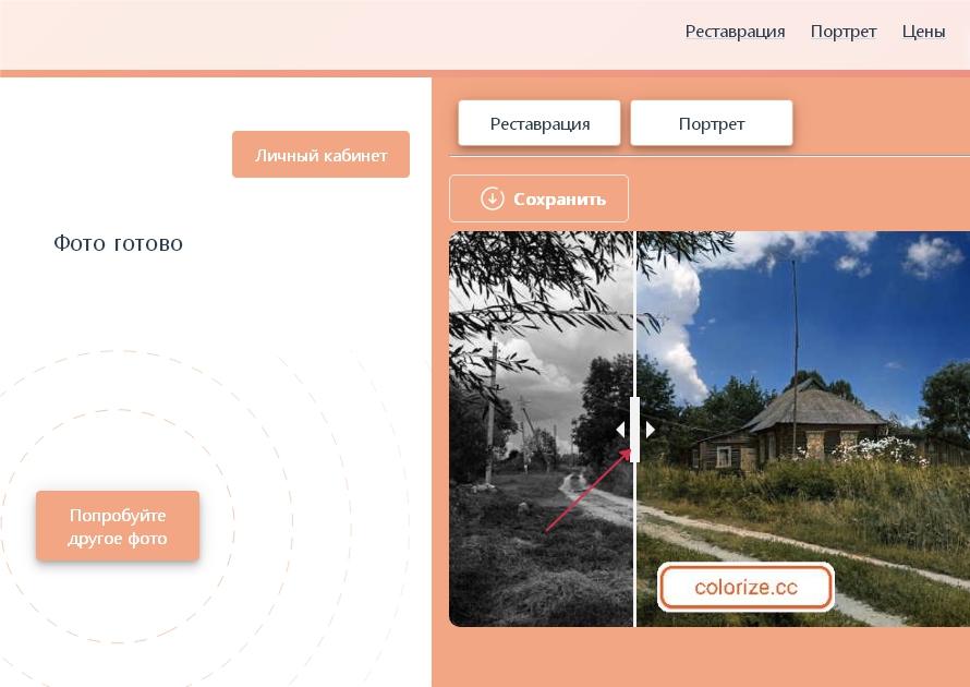Сервис, который раскрашивает черно-белое фото. Для тестирования регистрация не требуется. Чтобы раскрасить фотографию нажмите на кнопку “Выберите файл”, все остальное сделает нейросеть онлайн. Результат отобразиться вместе с ползунком. Чтобы увидеть “до” и “после”, двигайте ползунок.