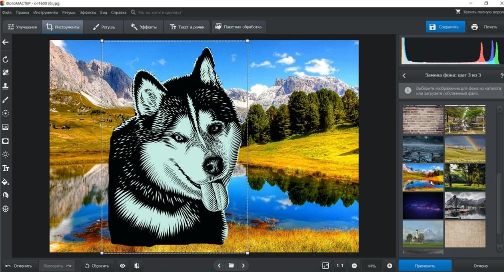- Смена фона – пользователю достаточно обозначить область, которую нужно отделить и программа все сделает сама, дальше меняем один фон на другой.