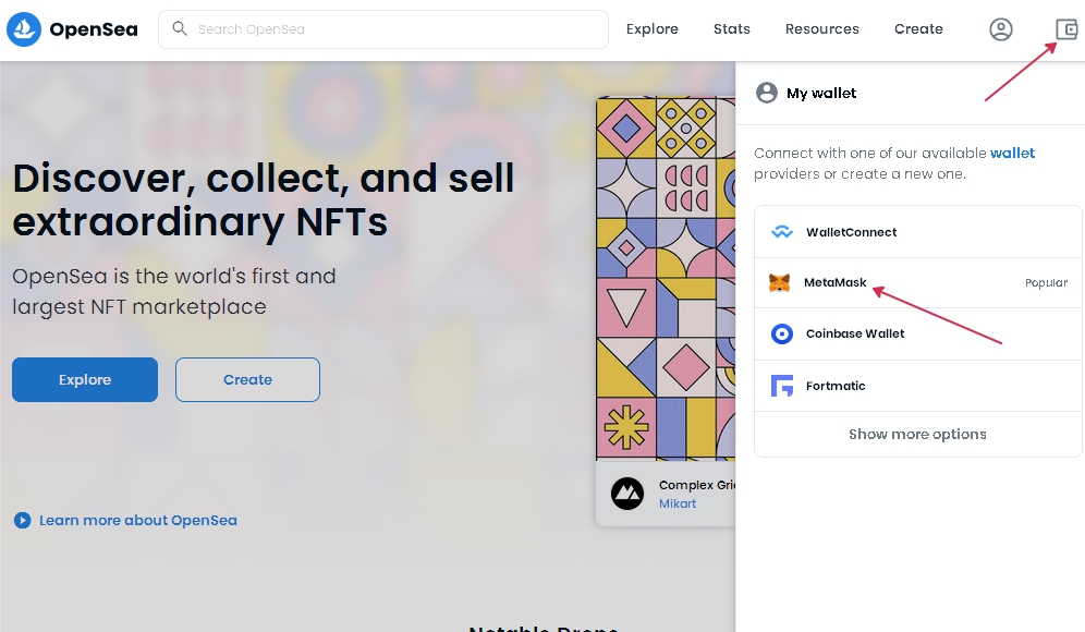 Opensea предлагает несколько видов криптокошельков, самым популярным является Metamask. Поэтому открываем панель “My Wallet” и выбираем Metamask, как показано на картинке.