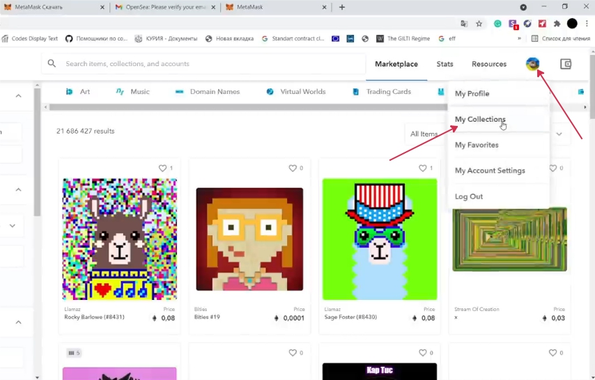 Когда верификация ящика успешна завершилась, возвращаемся в Opensea, переходим к созданию коллекции, где будут храниться наши NFT. Для этого щелкаем на иконку аватарки справа вверху и выбираем My Collections дальше “Create”.