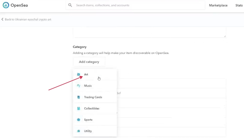 После завершении всех этапов коллекция будет создана, нажимаем на неё и выбираем иконку карандаша “Edit” и добавляем дополнительные данные. Это нужно чтобы пользователям было проще найти вашу коллекцию и все размещенные в ней NFT. Заполняем поля, включая описания, и выбираем категорию, если например, работы в основном картинки, то здесь останавливаем свой выбор на Art.