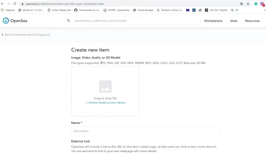 Мы разобрали nft что это простыми словами и узнали какие площадки существуют, теперь приступим к созданию токена. Переходим на страницу My Collections, выбираем свою коллекцию и пункт “Add New Item”. Страница Create New Item, здесь загрузим тип файла. Список поддерживаемых типов файлов указан, это может быть картинка или звук. Максимальный размер 40Мб.