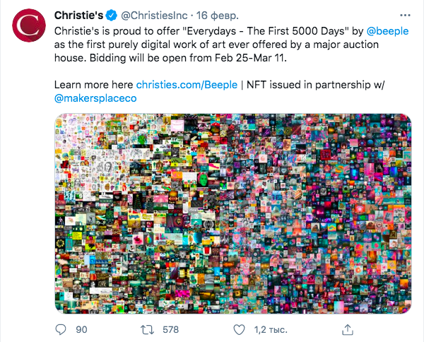 В этом же месяце Илон Маск опубликовал в твиттере сообщение, что написал песню об NFT и хочет её продать. Стоимость песни оценивалась в 1 млн долларов, через несколько дней директор Tesla отказался от затеи продать свой token. Однако певица Граймс, которая является партнером Маска, выставила на продажу 10 произведений с изображением героев-херувимов. Они были проданы в течение 20 минут по цене 5.8 млн долларов. Разместить можно все что угодно, графические изображения или музыку. Многие могут задаться вопросом nft картины что это? Ответ здесь достаточно простой, это графическое изображение с уникальной записью, которая внесена в реестр блокчейн. Ярким примером здесь будет сборник иллюстрации “The First 5000 Days (Ежедневно: первые 5000 дней)” данный сборник сделал художник Майк Винкельманн.