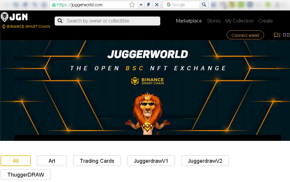 3. Juggerworld – этот магазин поддерживает возможность делать токены по стандартам BEP-721 или BEP-1155. В Juggerworld также можно подключить кошелек Metamask и через него работать или воспользоваться другим кошельком.