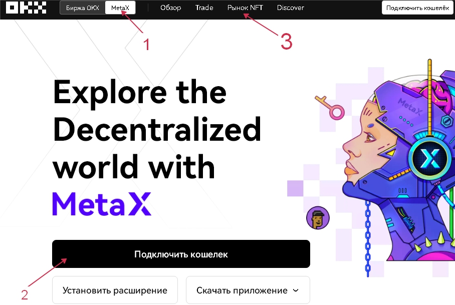 4. OKEx – чтобы получить доступ к панели создания токена, нужно сначала перейти в MetaX, для этого щелкните по кнопке в левом углу экрана. Дальше “подключите кошелек” и перейдите на “Рынок NFT”, там уже можно приступить к созданию токена. Последовательность действий показана на картинке.