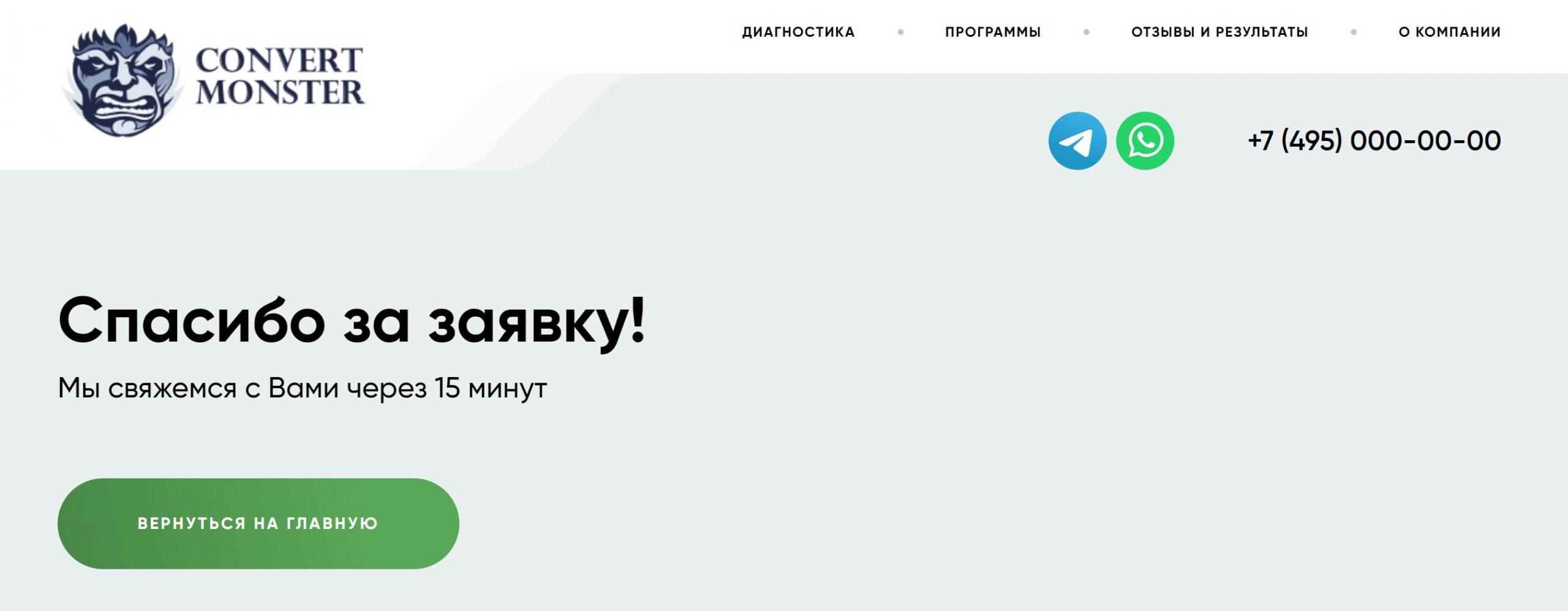 Главная цель форм на сайте — это связь посетителя с владельцем услуги. И поэтому если формы не будут корректно работать, посетитель сайта не получит нужную услугу, а владелец не получит нового клиента. Самые главные пункты в работе форм: клиенту на указанную электронную почту должна прийти заявка с данными из формы (Имя, телефон посетителя и другое), а посетителю после отправки формы должно показаться сообщение о том, что форма успешно отправлена, либо перенаправить на страницу благодарности с примерным текстом «Спасибо за заявку! Наш менеджер свяжется с вами через 15 минут». Пример реализации на нашем лечащем предложении по аудиту сайта, трафика и отдела продаж. Можете использовать наш текст, он предельно понятный для пользователя, простой и эффективный.