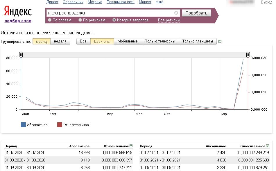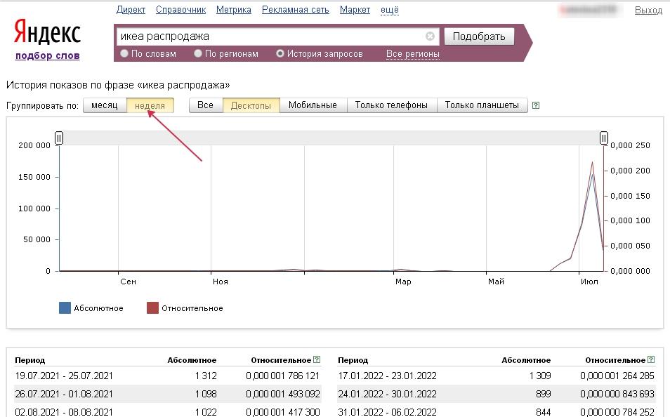 Приведем пример. Недавно ИКЕЯ объявила о своем решении приостановить работу в России, вследствие чего в магазине открыли сезон распродаж. Посмотрим график запросов за последний период. Для этого откройте яндекс вордстат и пропишите запрос, потом установите кнопку “история запросов” и вы увидите такой график.