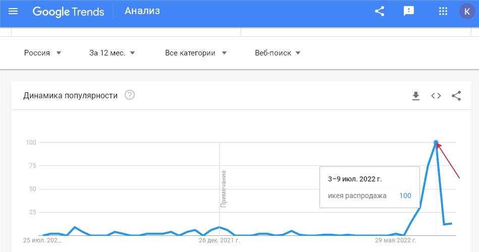 В поисковой строке задайте запрос. Посмотрим, сколько спрашивали “икея распродажа” через google. Проверим динамику и сделаем вывод, что самый пик приходится на 3-9 июля. Это связано с тем, что IKEA объявила о своей распродаже в России 5 июля.