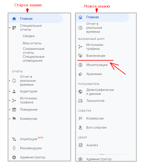 Кроме того нововведения коснутся и Google Analytics 4, некоторые метрики там отсутствуют. К примеру, показатель отказов заменен на вовлеченность. Кроме того само меню также претерпело изменений.