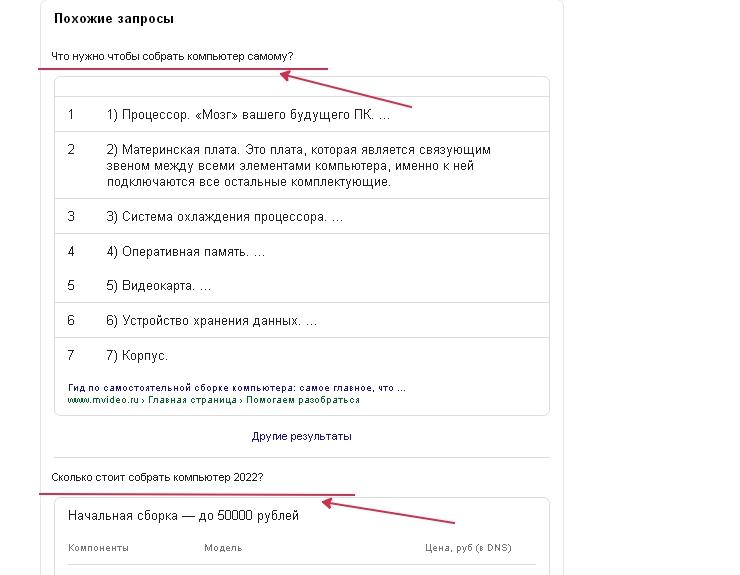 2. Создание FAQ (вопросы и ответы) – пользователи хотят быстро получать ответы на свои вопросы, поэтому рекомендуется создать специальный раздел. Чтобы понять, что интересно пользователям введите запрос в поисковике и посмотрите раздел “Похожие запросы”. Например “как собрать компьютер”.
