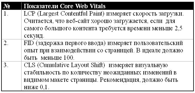 В мае 2021 года вступили новые факторы оценки качества ресурса, Core Web Vitals. Это индекс скорости загрузки сайта. При работе учитывается три основных показателя.