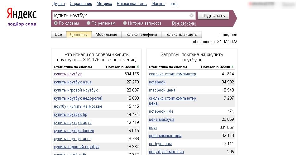 Проведем исследование, сколько спрашивают один и тот же запрос под разные устройства. Открываем wordstat yandex и начинаем делать поиск по ключевому слова “купить ноутбук”. Для начала проверим на ПК. Нажимаем кнопку “десктопы”. Результат 304 175 показов в месяц.
