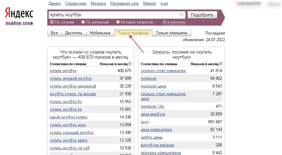 Проверим для смартфонов. Нажимаем “только телефоны”.