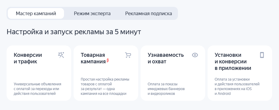 Мастер кампаний доступен в любом рекламном аккаунте Яндекса, но работа с ним начинается для рекламодателя с четкого понимания — какая цель стоит перед запускаемой рекламой: