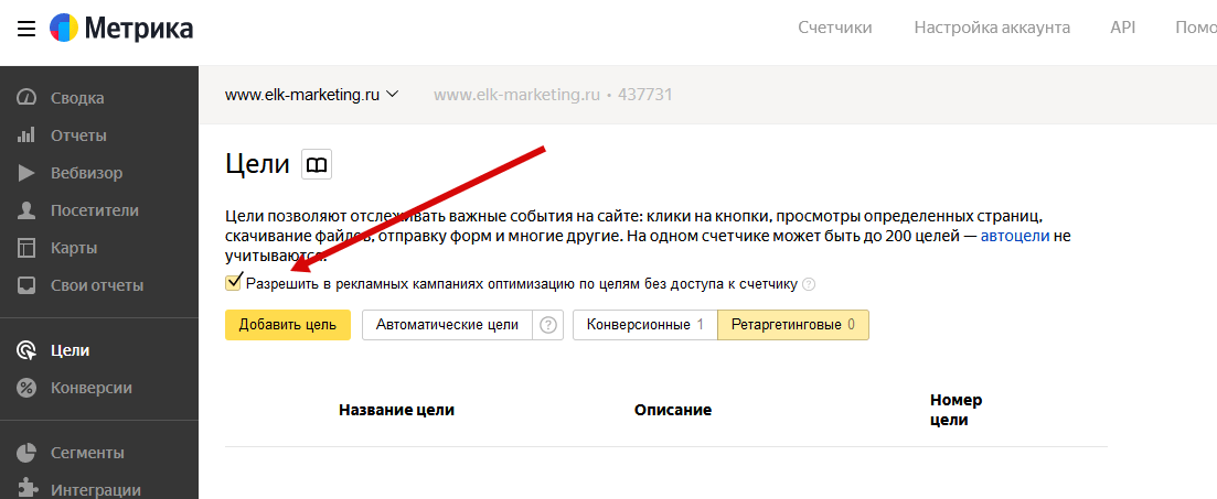 Впрочем, с мая 2022 года появилась возможность оптимизации рекламы без привязки Яндекс.Метрики к рекламной кампании. Для того, чтобы воспользоваться этим функционалом, попросите владельца сайта в аккаунте Яндекс.Метрики в настройках раздела “Цели” активировать галочку “Разрешить в рекламных кампаниях оптимизацию по целям без доступа к счетчику”, и тогда при запуске рекламы вы сможете использовать цели для оптимизации кампаний: