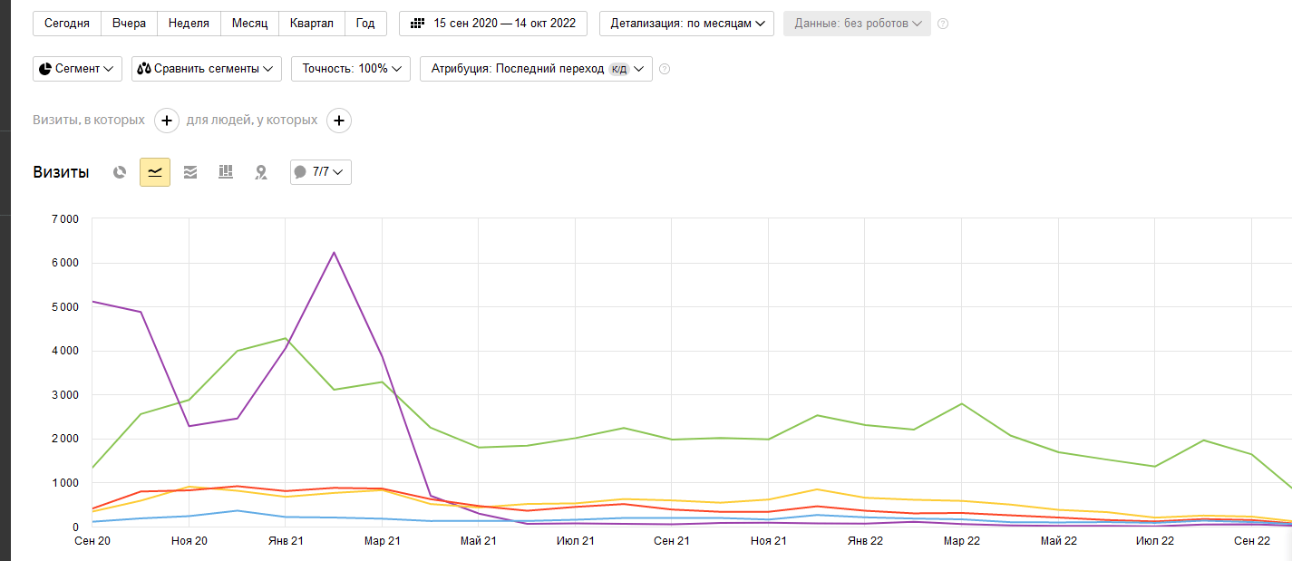 Вторая важная ошибка, которая приводит к путанице — отсутствие внимания к показателю “Точность“ при просмотре диаграмм. Обратите внимание на рисунки ниже, на них данные по источникам трафика одного и того же сайта за 2 года (один и тот же период), но с разной точностью: 1% и 100%