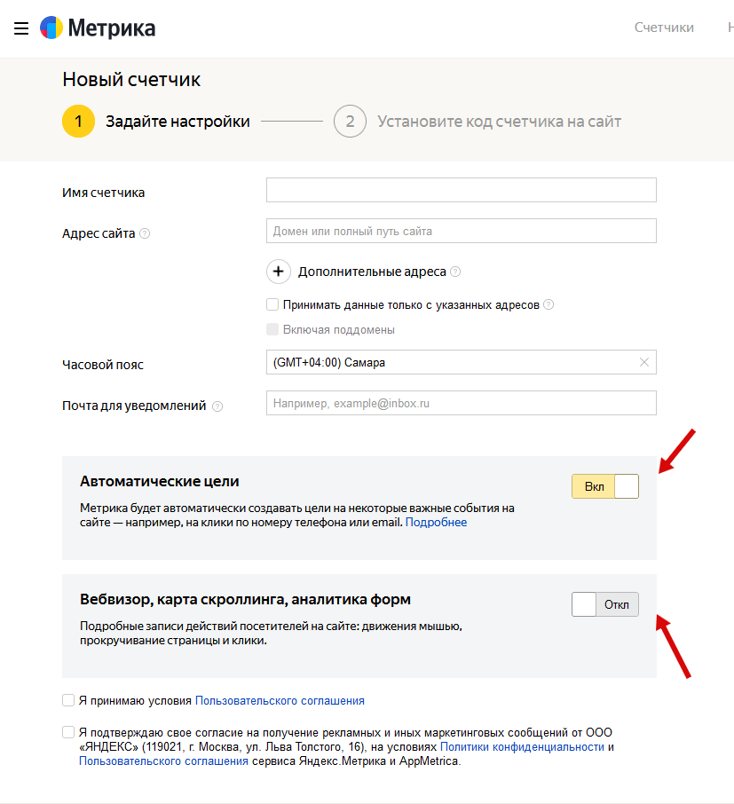 Выбрав нужные функции и заполнив все поля, принимаете условия использования Метрики и нажимаете кнопку “Создать счетчик”.
