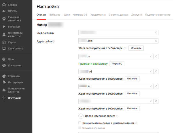 Для того, чтобы злоумышленники не могли собирать вам спамные аудитории или накручивать показатели счетчика, выберите галочку “Принимать данные только с указанных адресов”, тогда Метрика будет собирать информацию только на выбранных вами сайтах.