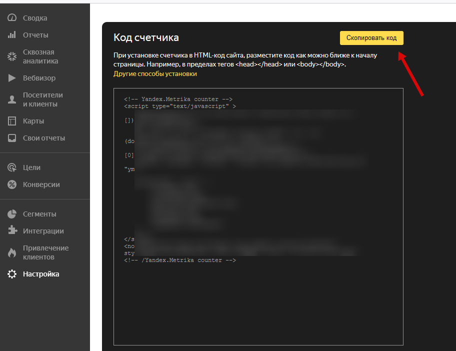 Если при создании Метрики вы не копировали код, не страшно, он всегда хранится в разделе счетчика “Настройки”, там же (под самим кодом) находится подробная инструкция по установке на сайте и рекомендации по проверке корректности установки кода Метрики. Проверка производится автоматически при нажатии на кнопку “Проверить”.