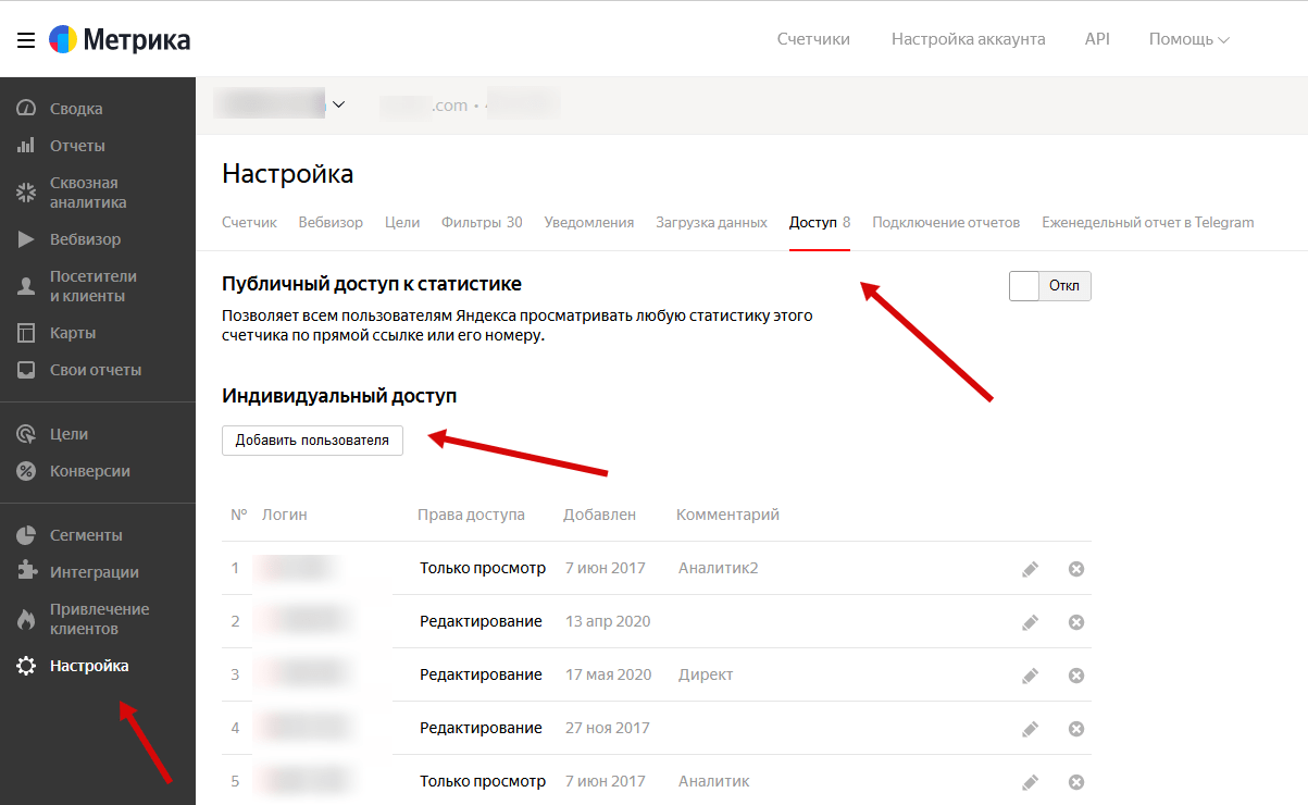 Чтобы предоставить доступ к Яндекс.Метрике сотрудникам или подрядчику, вам не нужно сообщать логин и пароль от основного аккаунта в Яндексе. Вы можете предоставить доступ к Метрике любому аккаунту в Яндексе, перейдя в раздел “Настройки / Доступ” и добавив нового пользователя.