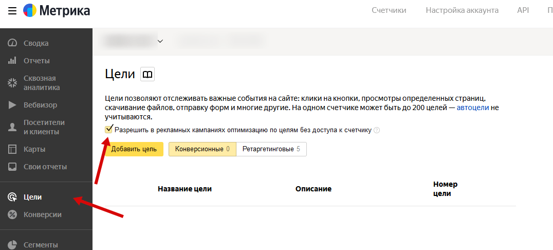 Ключевой функционал Метрики, позволяющий оценить эффективность сайта и мероприятий по продвижению — отслеживание целевых действий пользователей. Создать цели для отслеживания можно в разделе Метрики “Цели”: