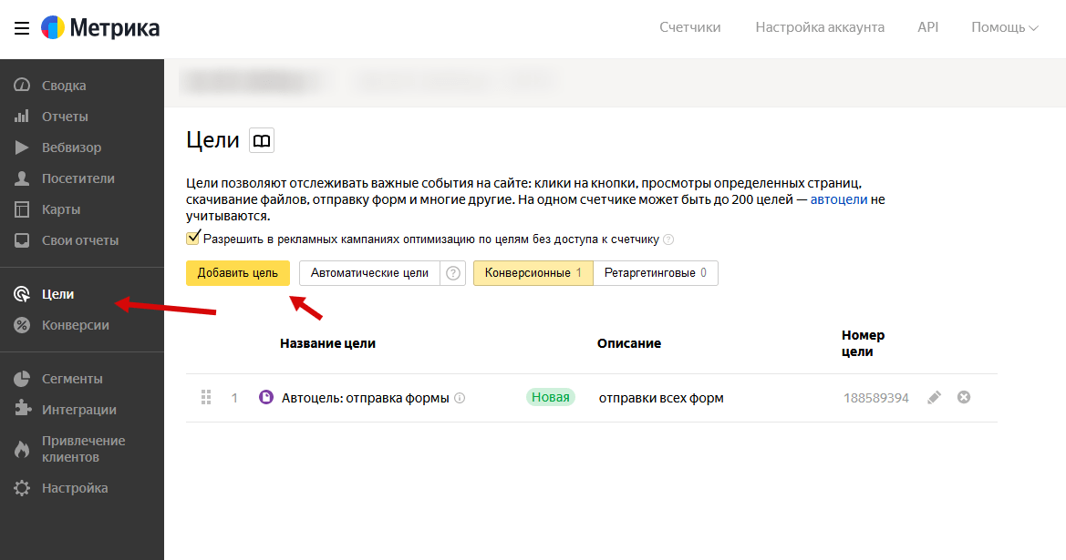 В разделе “Цели” отображаются все созданные вручную цели, а также автоцели, сформированные Метрикой на основе анализа сайта.