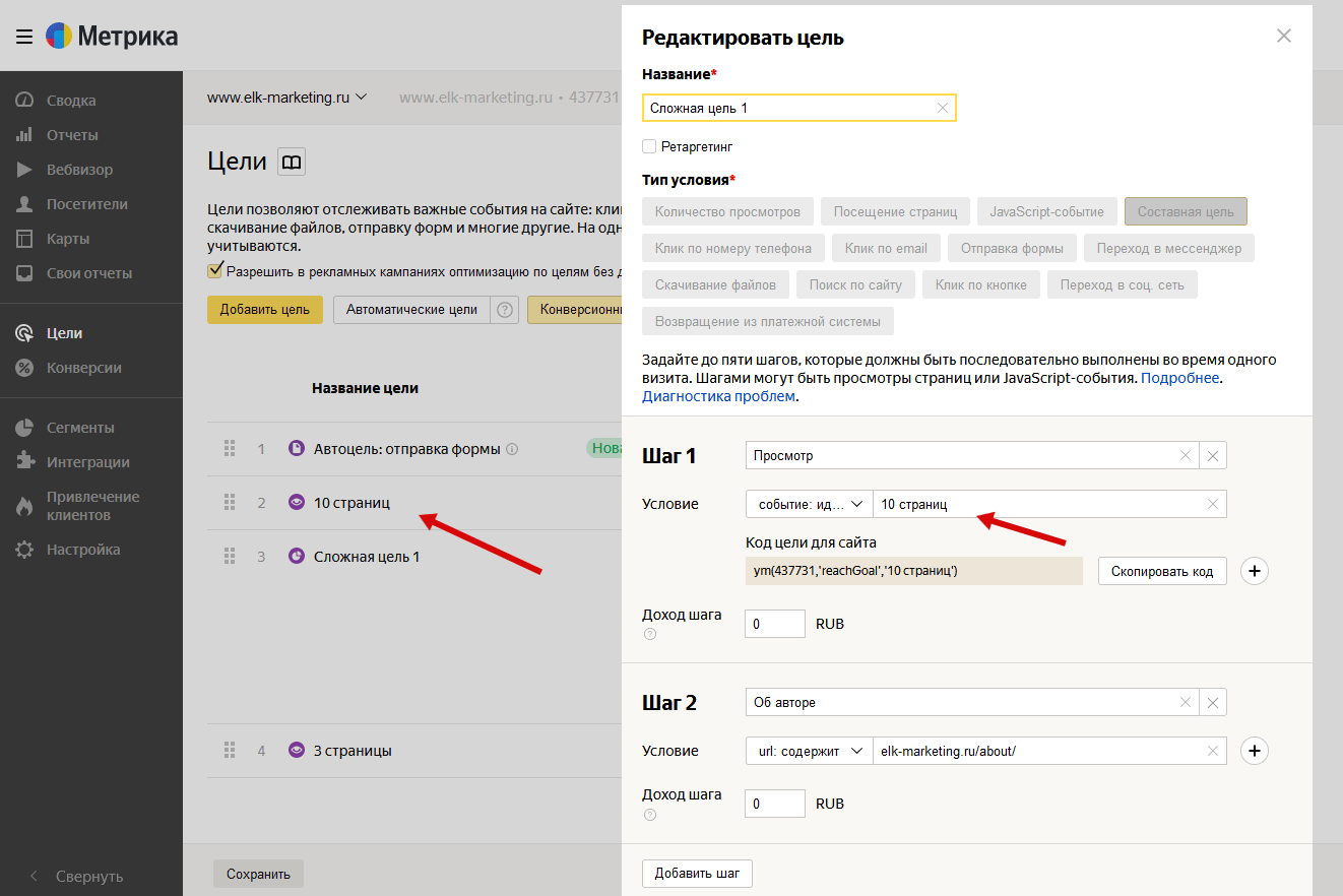 Чтобы сформировать составную цель, используйте функцию “Добавить цель” / “Составная цель”. Предварительно создайте цель, содержащую нужно вам событие или просмотр определенного количества страниц, запомните идентификатор этой простой цели.