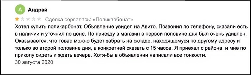 Разберем реальный отзыв на покупку поликарбоната. Бывают ситуации, когда при посещении магазина, товар не оказывается в наличии и нужно ехать на склад. Такая ситуация случилась с Андреем.
