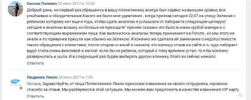 На следующем скриншоте отзыв в клинике. В качестве компенсации предлагают бонус – VIP карту.