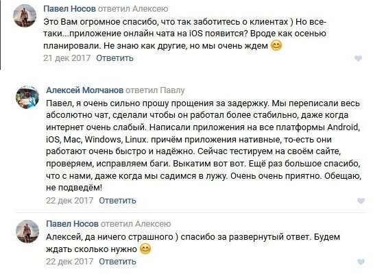 После непродолжительной беседы, недовольных клиентов лучше переводить в личку. Публичный чат плох тем, что любой может встрять в разговор. Например, покупатель описывает свою проблему и тут появляется тот, у которого была такая же проблема месяц назад и начинает про это писать. Ответить всем достаточно сложно. Поэтому переадресуем всех в личное сообщение. Если на сайте добавлен чат, предложите написать туда, где сотрудники ответят на все вопросы. В случае отсутствия чата адресуйте всех в социальные сети.