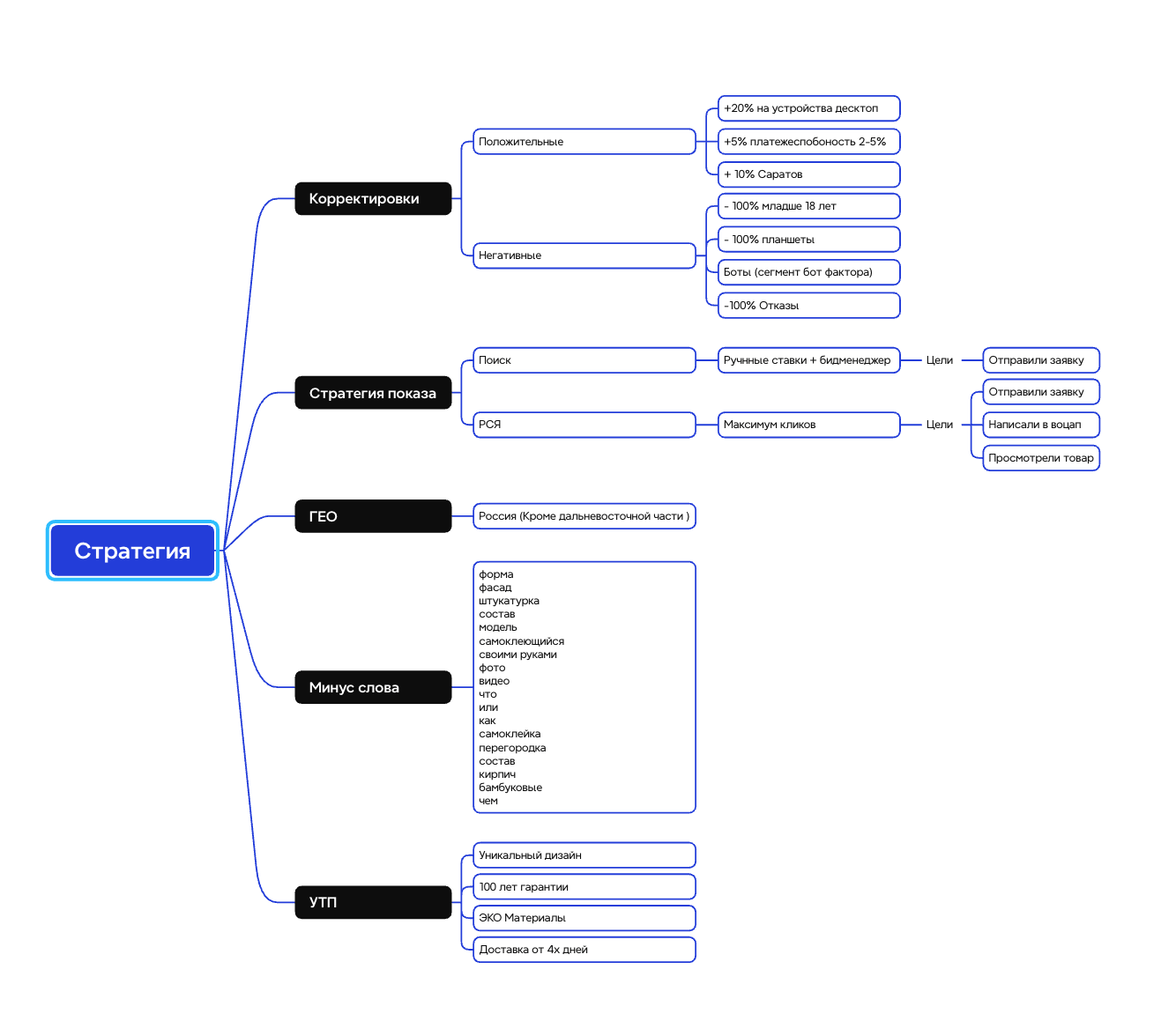 • Борьба с нерелевантом: Для максимальной чистоты трафика использовались точные вхождения (кавычки) для ВЧ-запросов, расширенные списки минус-слов, отключен автотаргетинг на поиске.