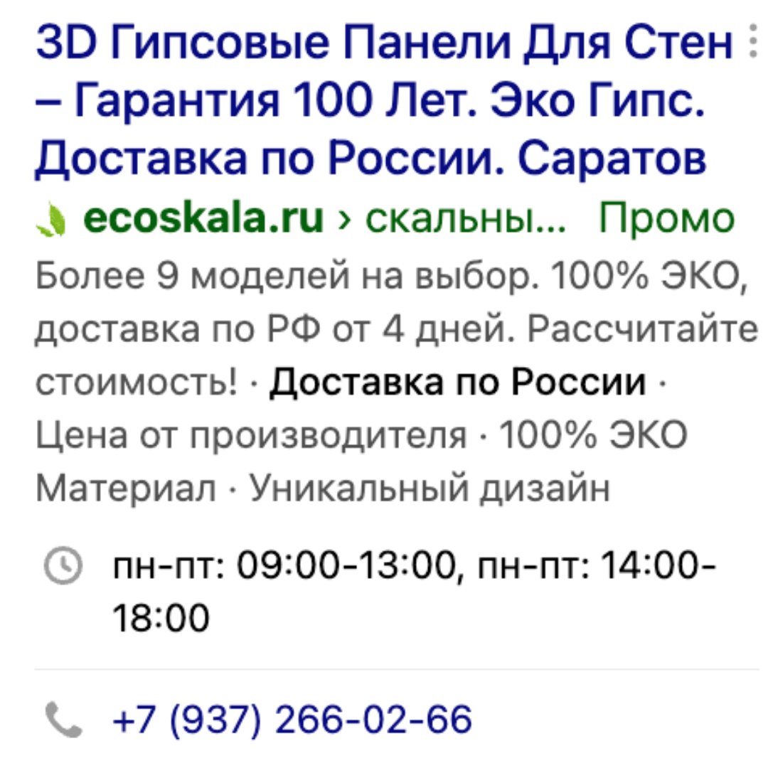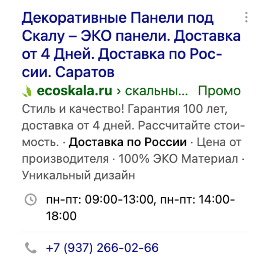 • УТП в креативах: В объявлениях делался акцент на ключевые преимущества, подтвержденные анализом аудитории: «Гарантия 100 лет», «Быстрая доставка по РФ», «Уникальный дизайн», «Экологичный материал».