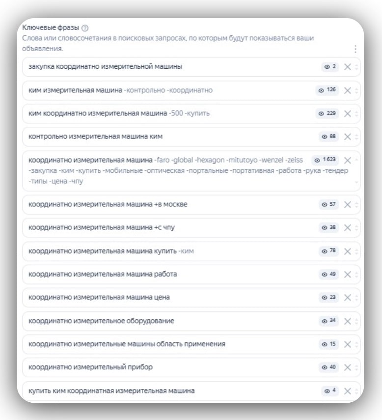 Поэтому мы приняли решение использовать, наряду с узкими целевыми, и широкие запросы по оборудованию, но при этом тщательно проработать списки минус-слов, чтобы минимизировать нерелевантный трафик.