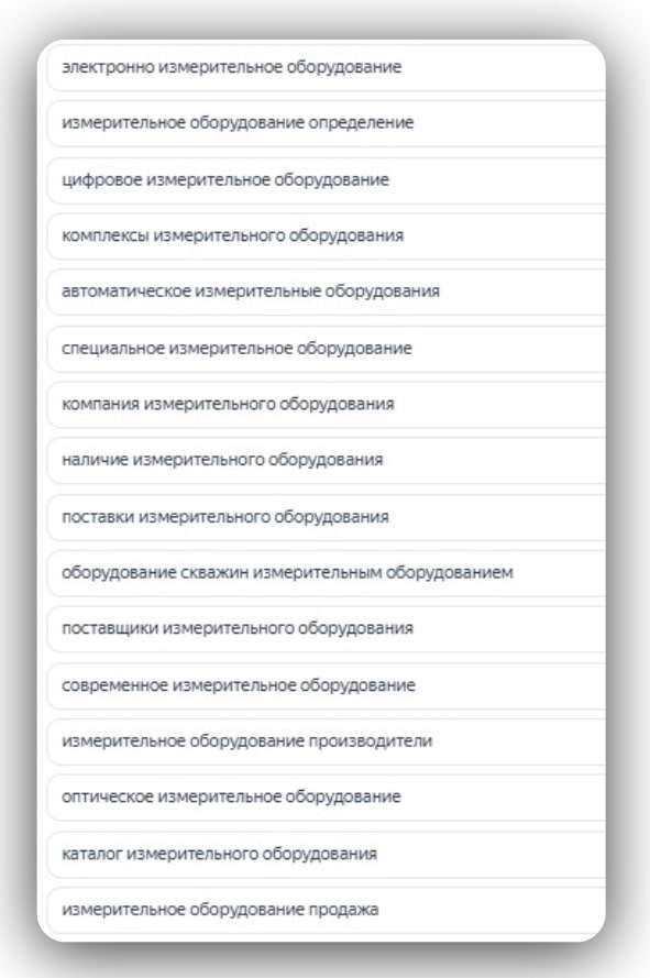 Помимо этого, нас ждала ещё одна сложность — работа с размытым семантическим полем. В нише промышленного оборудования запросов много, но большая часть нерелевантна. Например, пользователи ищут мелкое лабораторное оборудование, микроскопы для учебных заведений или даже бытовые приборы, совершенно не связанные с задачами заказчика. Целевая же семантика, как правило, низкочастотная и не даст нужного объема трафика.