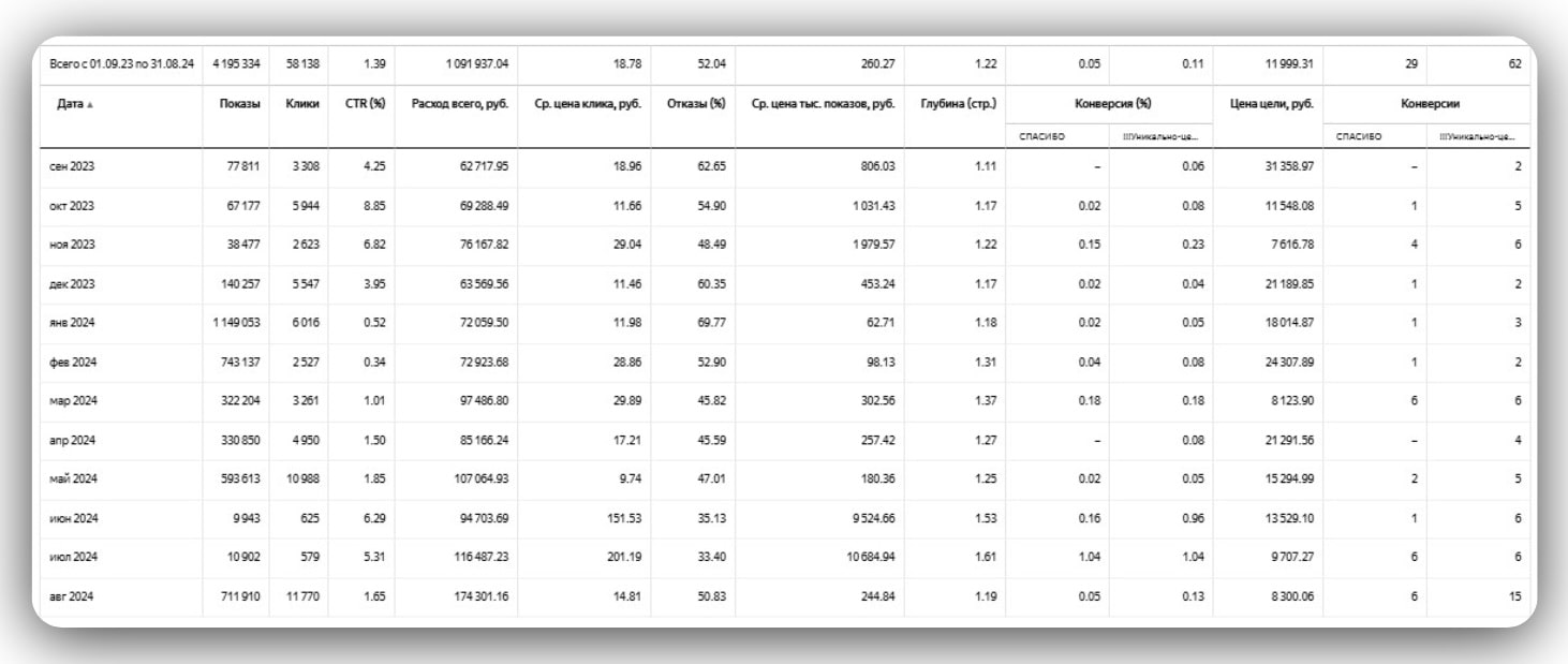 На данный момент работа над проектом продолжается, мы постоянно занимаемся улучшением запущенных кампаний и экспериментируем с новыми таргетингами. Например, в августе мы снова попробовали усилить кампании в РСЯ по новым гипотезам. Да, увеличились отказы и упала общая конверсия, но вместе с этим выросло количество заявок и снизился средний СРА.