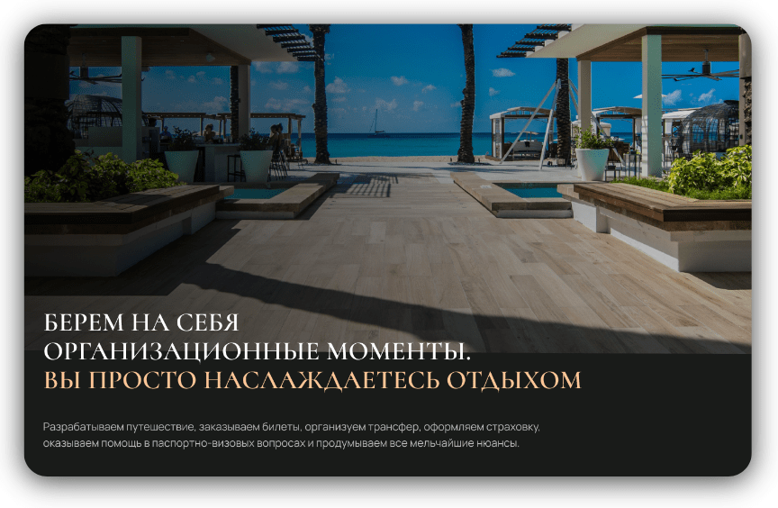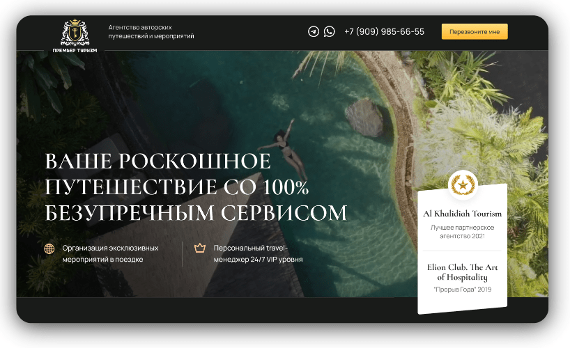 Главный заголовок "Ваше роскошное путешествие со 100% безупречным сервисом" усиливает ощущение эксклюзивности и гарантирует высокий уровень сервиса на протяжении всей поездки. Один из подофферов подчеркивает, что компания готова организовать не только путешествия, но и эксклюзивные мероприятия в поездке, что расширяет спектр предлагаемых услуг и делает их особенно привлекательными для клиентов, ищущих уникальные впечатления. Второй подоффер о персональном travel-менеджере VIP уровня создает ощущение постоянной поддержки и уверенности в том, что все потребности клиента будут удовлетворены.