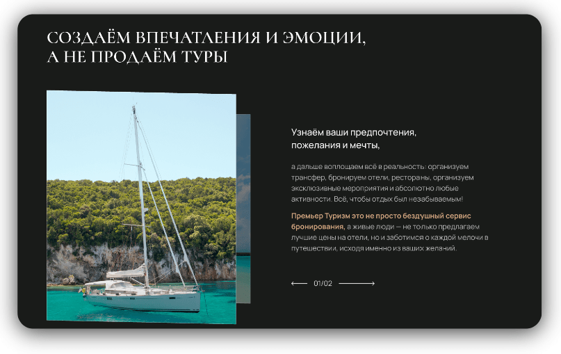 На втором экране раскрывается философия компании и её подход к организации путешествий. Заголовок "Создаём впечатления и эмоции, а не продаём туры" отражает основную идею бренда — ориентированность на создание уникальных, запоминающихся моментов, а не просто на оказание стандартных туристических услуг. Подчеркивается, что компания занимается не только организацией трансферов, бронированием отелей и ресторанов, но и созданием эксклюзивных мероприятий и активностей, которые делают отдых по-настоящему незабываемым. Акцентируется внимание на том, что "Премьер Туризм" — это не просто сервис бронирования, а команда живых людей, которые не только предлагают лучшие цены на отели, но и внимательно относятся к каждому аспекту путешествия, учитывая индивидуальные пожелания клиента. Такой подход подчеркивает человеческое участие и заботу, что особенно важно для целевой аудитории премиум-класса.