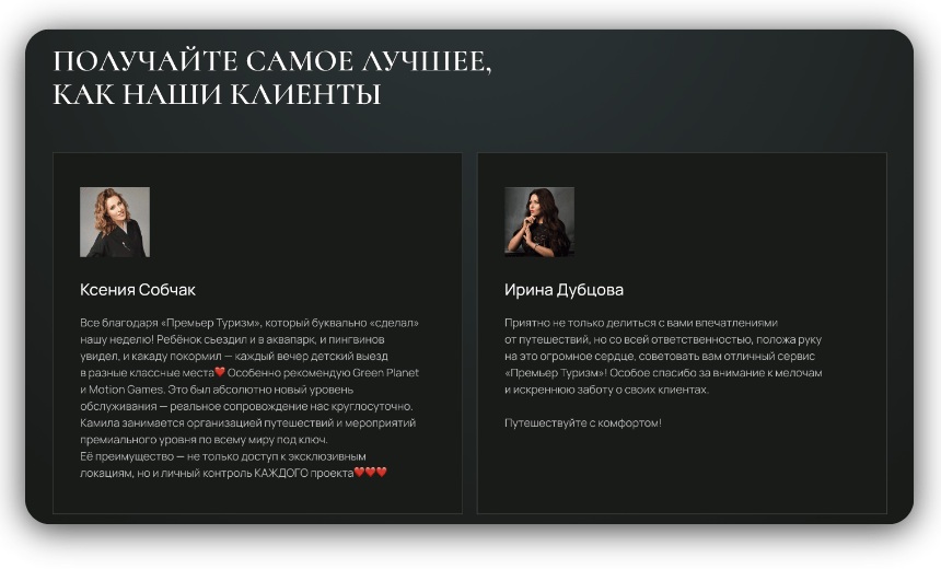 Такой блок отзывов наглядно демонстрирует, что "Премьер Туризм" успешно справляется с самыми сложными запросами и способен превратить любую поездку в уникальное и комфортное приключение.