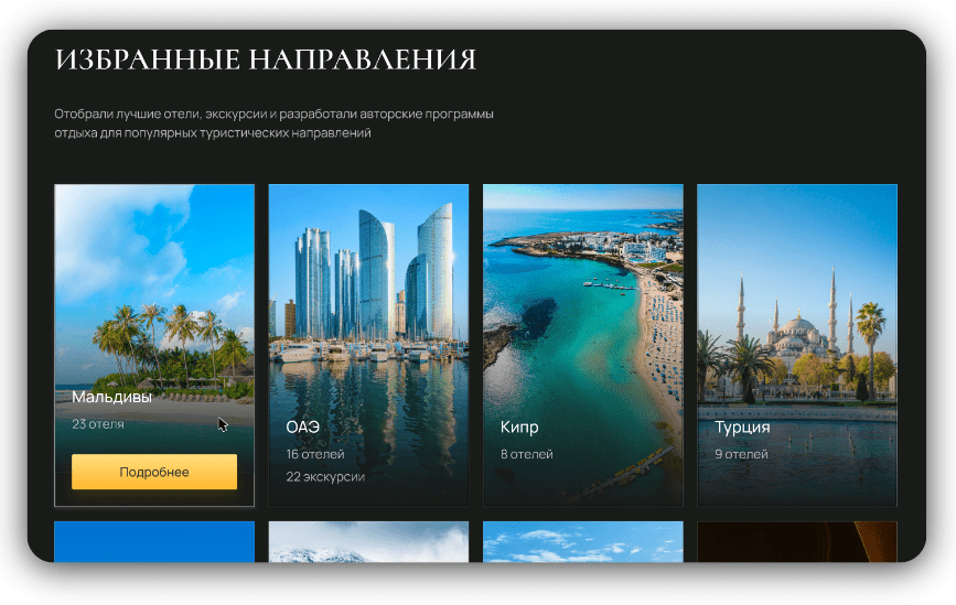На четвертом экране внимание сосредоточено на избранных направлениях и предложениях, которые компания тщательно отобрала для своих клиентов. Здесь указаны популярные туристические направления, такие как Кипр, Турция, Мальдивы, ОАЭ, а также уникальные авторские туры по Камчатке, Алтаю и Азербайджану. Каждое направление сопровождается информацией о количестве доступных отелей, экскурсий и авторских программ, что демонстрирует широкий выбор вариантов для путешествий.