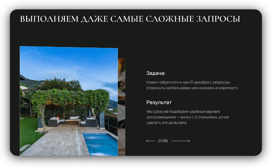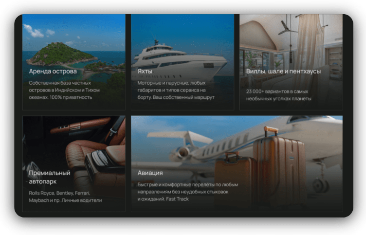 На следующем экране представлены эксклюзивные услуги, подчеркивающие премиальный уровень сервиса компании: аренда острова, ассортимент яхт, более 23 тысяч вариантов элитного жилья, премиальный автопарк. Далее приводится форма, которая призывает клиентов реализовать свои идеи путешествий, оставив заявку на консультацию.