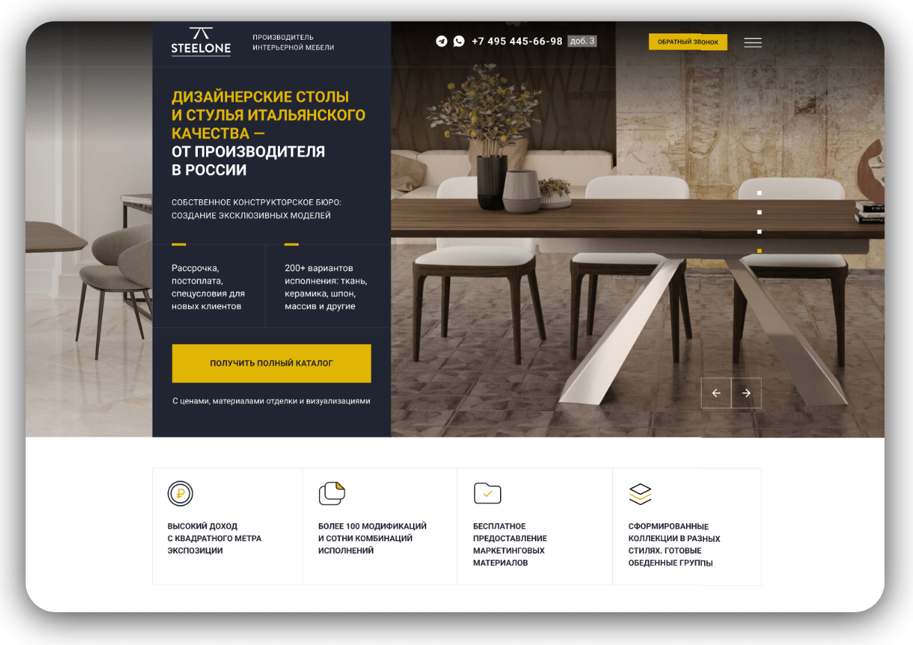 Кнопка «Получить полный каталог» побуждает пользователей к немедленному взаимодействию, предлагая доступ к более подробной информации о продукции, ценах и условиях сотрудничества.