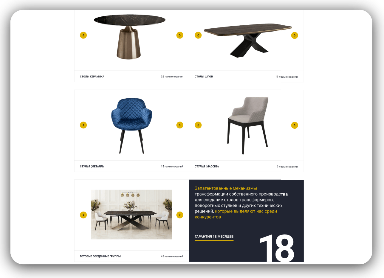 Отдельно отмечается наличие собственных запатентованных механизмов трансформации, которые используются для создания столов-трансформеров и поворотных стульев. Эти уникальные технические решения выделяют продукцию компании на рынке и предлагают дополнительные функциональные возможности для клиентов.