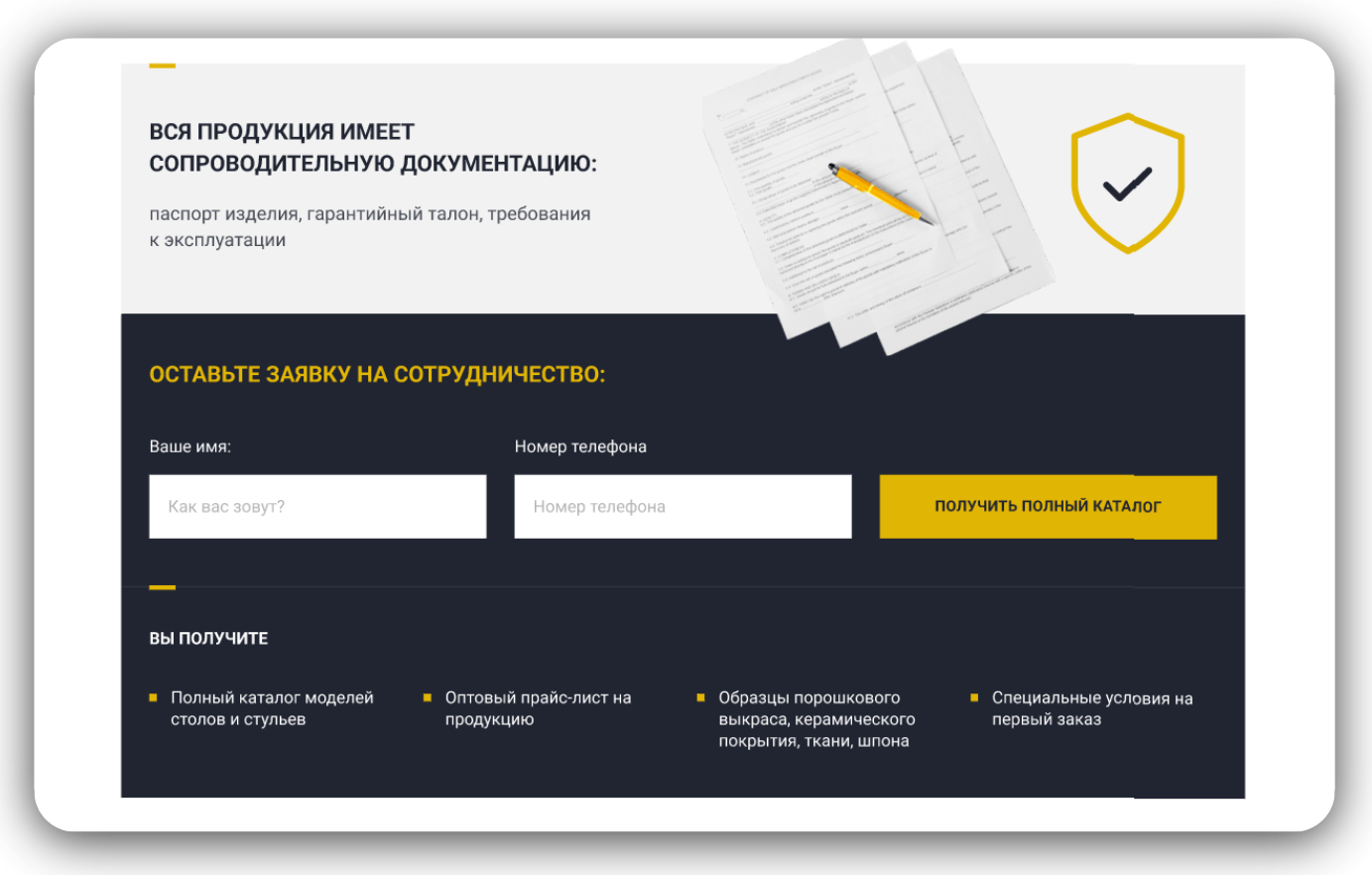 Ниже находится форма для сотрудничества, описаны файлы и документы, которые пользователь получает при ее заполнении: полный каталог моделей столов и стульев, оптовый прайс-лист, образцы порошкового выкраса, керамического покрытия, ткани, шпона, а также специальный условия на первый заказ.
